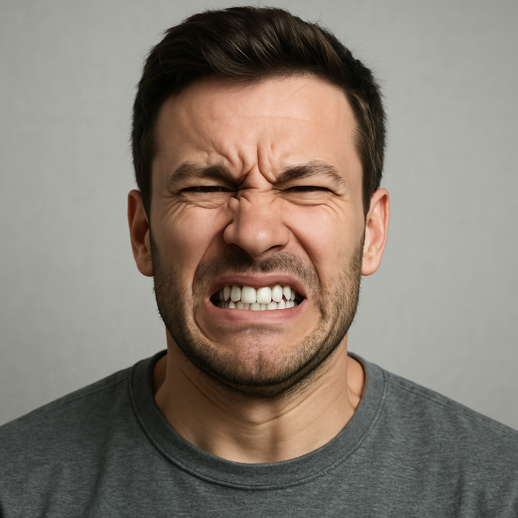 grimace - An ugly, twisted expression on a person's face, typically expressing disgust, pain, or wry amusement